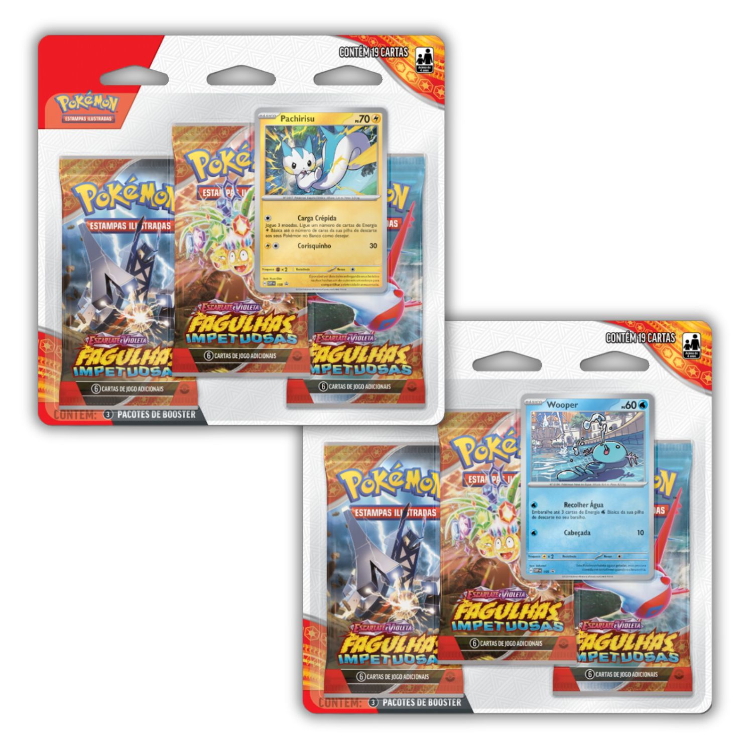 Contém 19 unidades de cartas no formato 63mm x 88mm (3 pacotes de boosters e 1 carta promocional de Pachirisu ou Wooper, a depender de sua escolha de variação).
