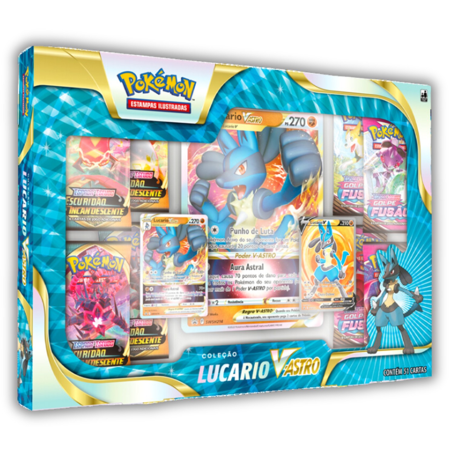 Nesta coleção, você receberá cartas holográficas promocionais jogáveis de Lucario V e Lucario V-ASTRO, e uma versão extragrande de Lucario V-ASTRO, além de pacotes de booster do Pokémon Estampas Ilustradas para aumentar a sua coleção!